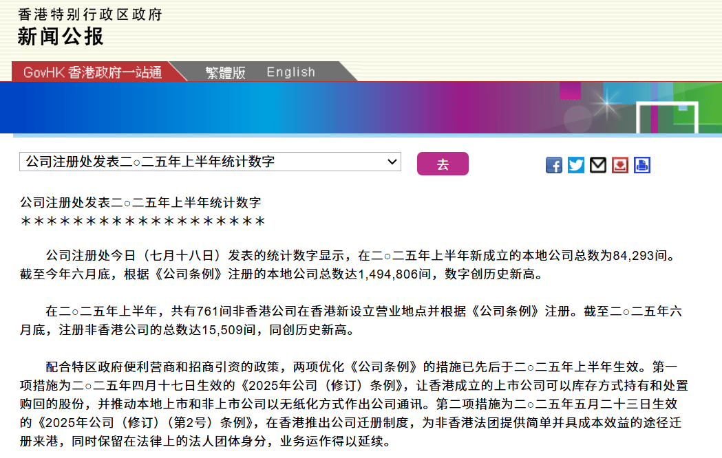 随着国家走出去战略的持续深化与粤港澳大湾区建设的加速推进,香港作为国际金融中心和商业枢纽的地位愈发凸显。截至2025年6月底,香港根据《公司条例》注册的本地公司总数达149.48万间,创下历史新高,这一数据充分印证了香港营商环境的活力与吸引力。