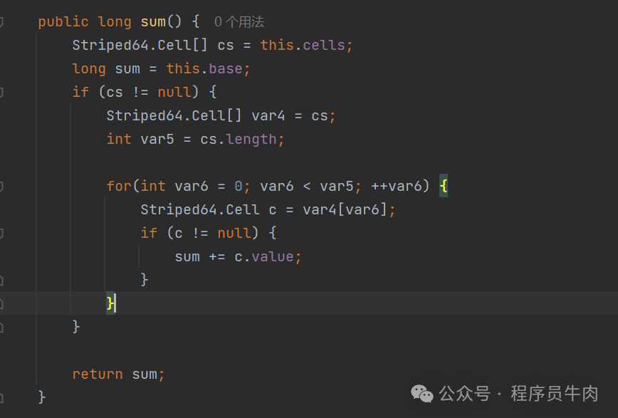 最后我们再来看一看LongAdder中是如何对base和cells数组的值进行求和的: