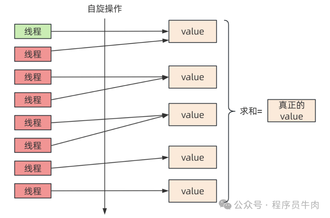 AtomicLong不是多个线程争夺一个value嘛?现在我们在LongAdder中就创建多个临时的value来供线程进行增值操作,而真正的value值等于这些临时value的值求和。