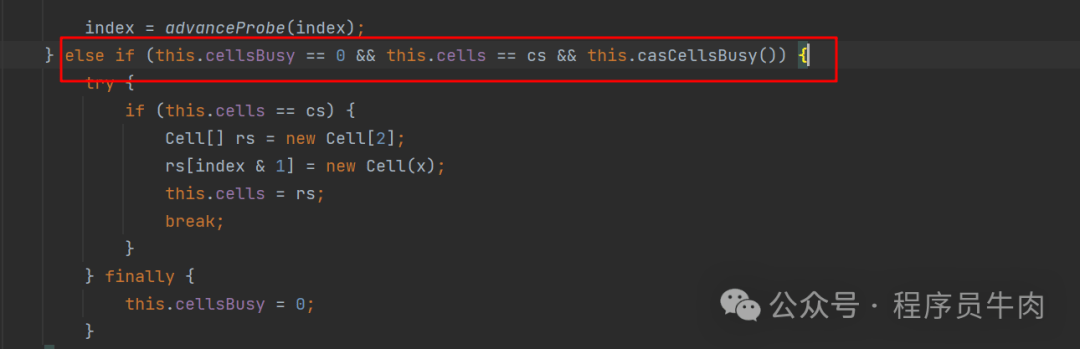情况三:走到这里说明当前的cell数组正在被初始化。因此它争取不到cellsBusy锁。开始尝试调用casBase操作来往base中写值。如果成功就结束本次循环。