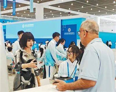 在上海合作组织天津峰会新闻中心,外国媒体记者与多模态交互型机器人“小合”对话。