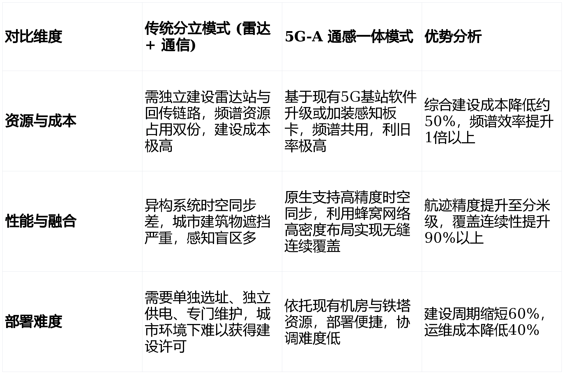 技术趋势:5G-A(5.5G)通感一体化技术的成熟,为通信与感知能力的深度融合提供了技术可能。传统雷达+通信分立建设模式存在建设成本高、频谱资源浪费、数据融合困难等弊端,而5G-A通感一体化模式通过硬件共用、频谱共享,实现了感知与通信的内生统一。